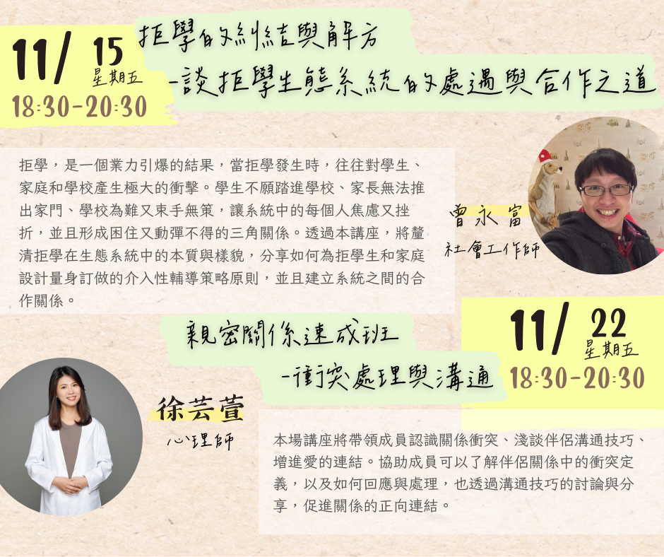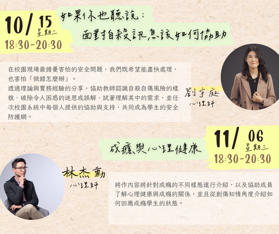 二、 | 為增進本市教師全人成長及自我覺察,且有機會紓解工作壓 力以達身心健康之效,國立臺北教育大學(心理諮商暨健康 促進研究中心)自113年9月22日至11月28日止,規劃辦理4場 次實體工作坊及5場次教師線上研習課程。倘有需求之教師,可逕至本局教師諮商輔導支持服務網站「最新消息」(https://ttsc.whjhs.tyc.edu.tw/news/)參閱課程資訊,並依課程說明至相應網址完成報名程序。 |