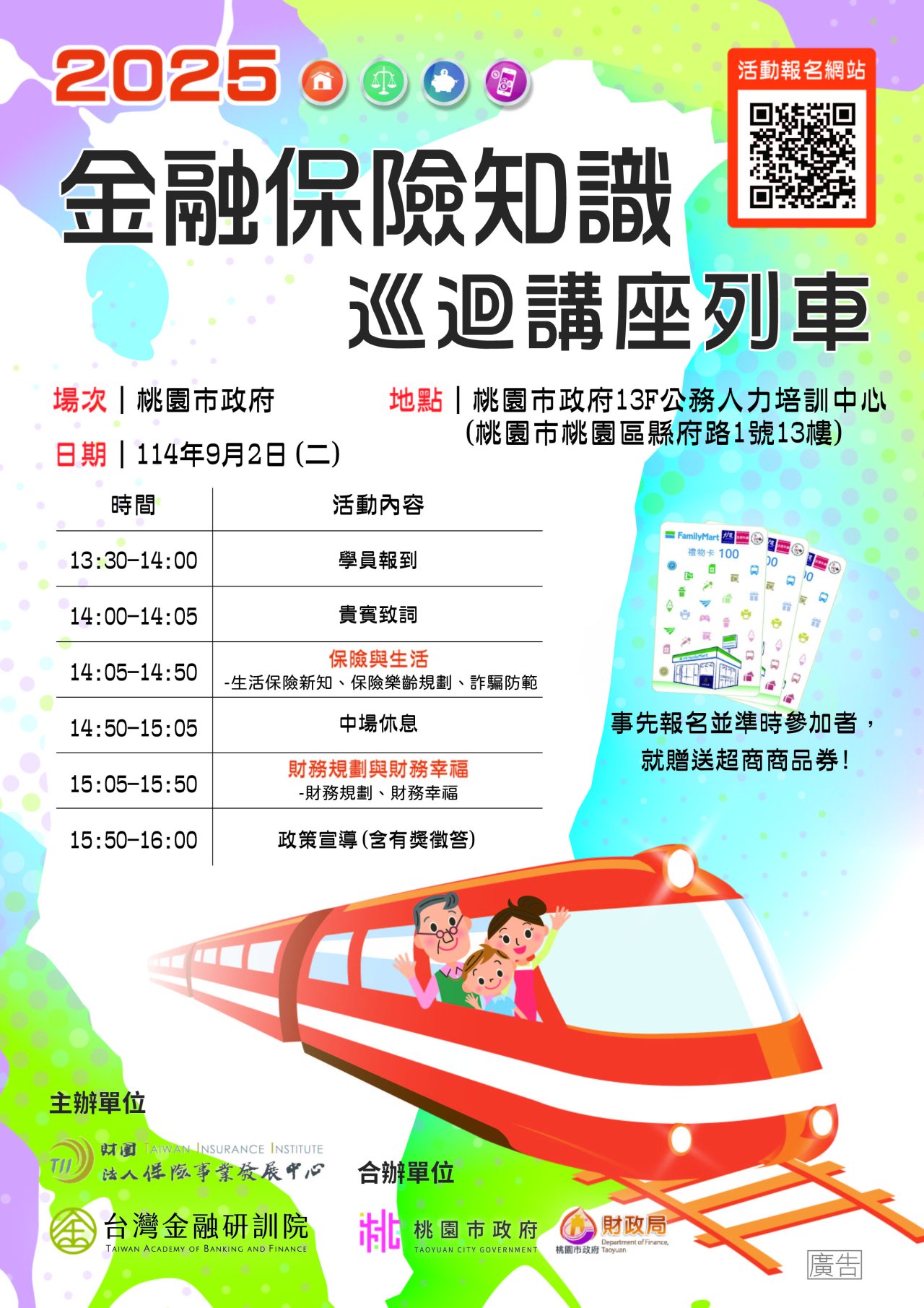二、 | 為期本市社會大眾建立正確金融權益與保險規劃觀念,並培養終身學習金融知識之習慣,本府與保發中心共同舉辦旨揭活動。本活動訂於114年9月2日(星期二)下午2時至4時(下午1時30分開始報到),假本府公務人力培訓中心(地址:桃園市桃園區縣府路1號13樓)舉行,本次活動為免費公益活動,內容包括「保險與生活」、「財務規劃與財務幸福」及「金融政策、ESG永續金融及性別平等宣導」(含有獎徵答),隨函檢附活動計畫書及海報各1份。 |