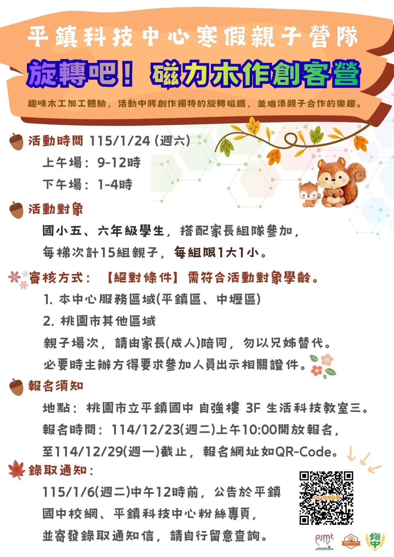 | 八、 | 錄取公告:1月6日(週二)12時前公告於平鎮國中官網與本中心粉絲專頁。 |