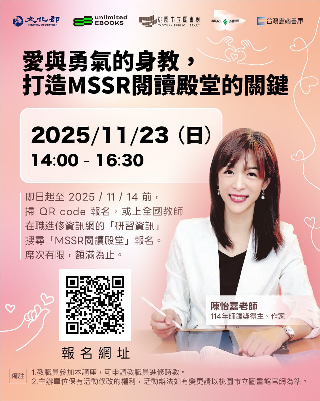 主旨:本館與遠流出版事業股份有限公司於114年11月23日舉辦 「愛與勇氣的身教,打造MSSR閱讀殿堂的關鍵」講座,請 貴校惠予協助宣傳,請查照。 說明: 一、緣起:根據明日閱讀理念實踐「身教式持續安靜閱讀」, 鼓勵教師身教示範,帶領學生一起養成持續自主閱讀與分 享好書的習慣。 二、本講座期望藉由講師分享教學技巧、對身教與教育的經驗 和信念,結合應用台灣雲端書庫豐富的電子書資源工具, 幫助教師與學生實現明日閱讀的價值,培養良好的閱讀習 慣與素養。 三、旨揭講座說明如下: (一)時間:114年11月23日(週日)下午2時至4時30分。 (二)講師:陳怡嘉(114年師鐸獎得主,臺北市立大安高級工 業職業學校教師) (三)講題:愛與勇氣的身教,打造MSSR閱讀殿堂的關鍵 檔 (四)地點:本館總館6樓多功能活動室(桃園市桃園區南平路 303號)。 (五)報名:請至全國教師在職進修資訊網報名 (https://www2.inservice.edu.tw)參與教師可申請研習 時數3小時。 四、檢附課程資訊及宣傳海報各1份, 請貴校協助宣傳。