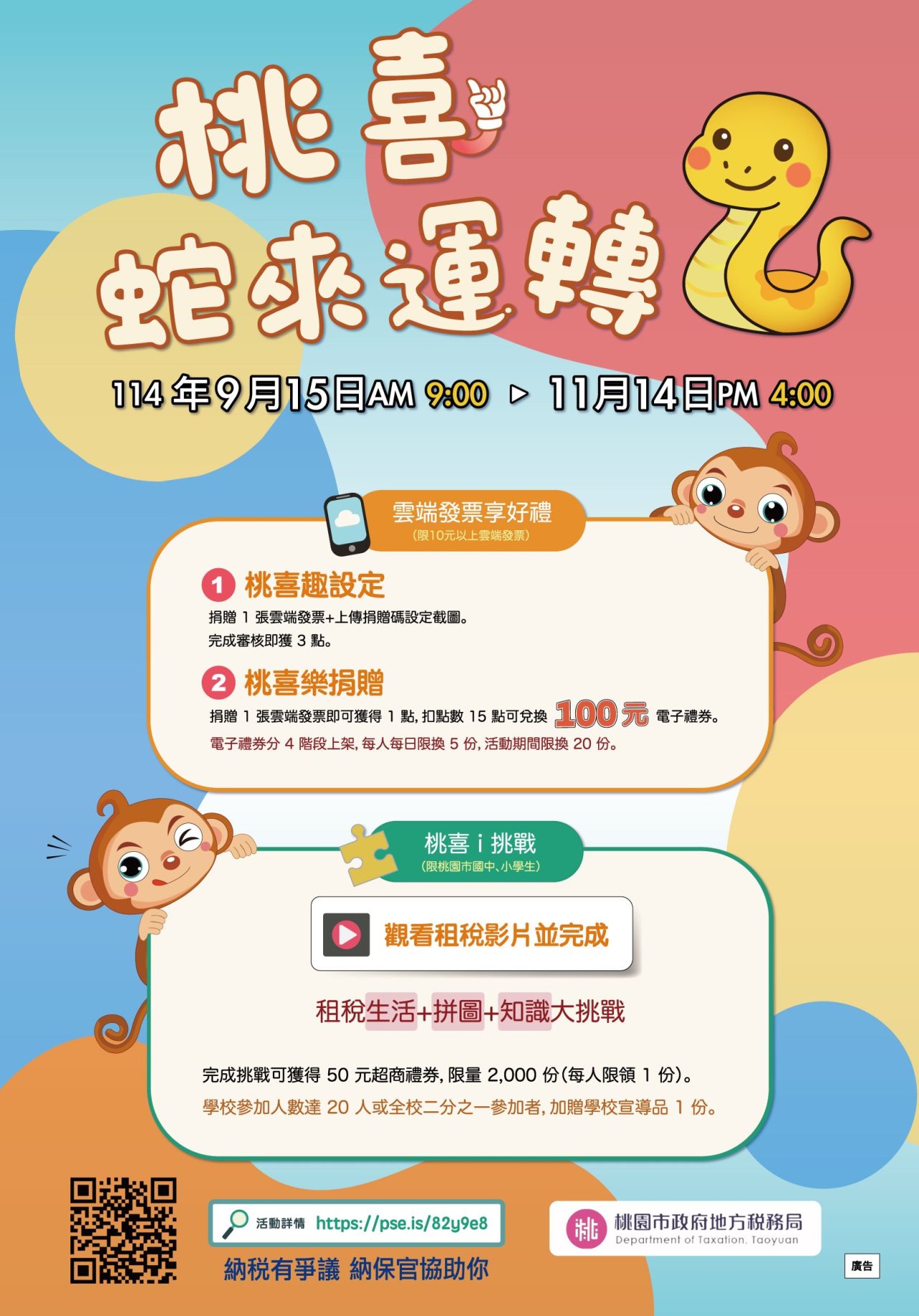主旨: | 檢送本局114年「桃喜蛇來運轉」網路活動之海報及辦法各1份,請貴校鼓勵學生及教職員踴躍參加,請查照。 |