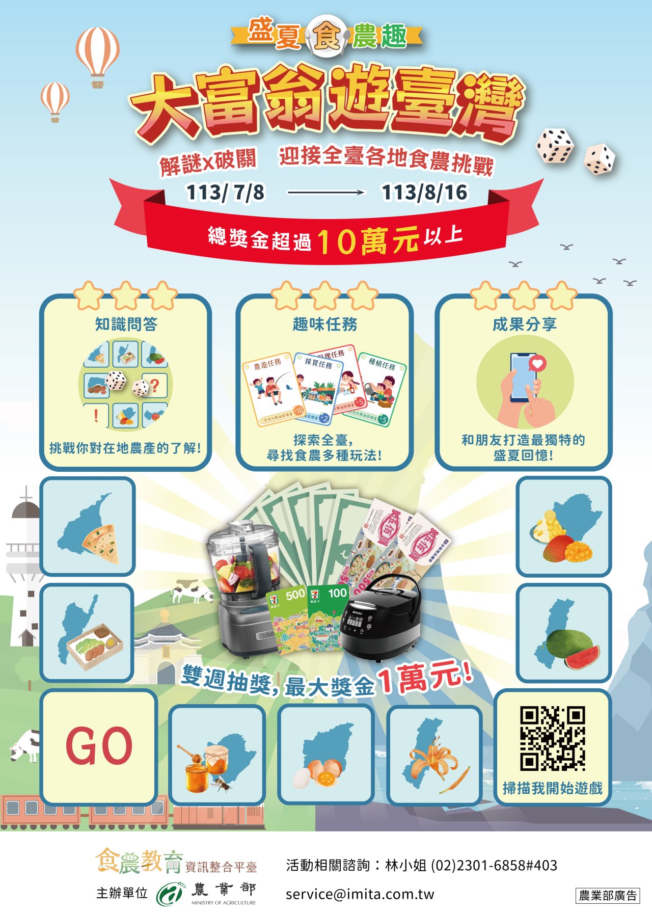 四、 為強化食農教育素養,並促使大眾更加瞭解食農教育,農業部應用該平臺內容,訂於113年7月8日至8月16日舉辦「盛夏食農趣:大富翁遊臺灣」食農教育推廣活動(網址:https://fae.moa.gov.tw/2024event/),提供食農教育相關知識問答、任務體驗與成果分享等遊戲,參與活動即可抽獎,總獎金超過10萬元,歡迎踴躍參與。