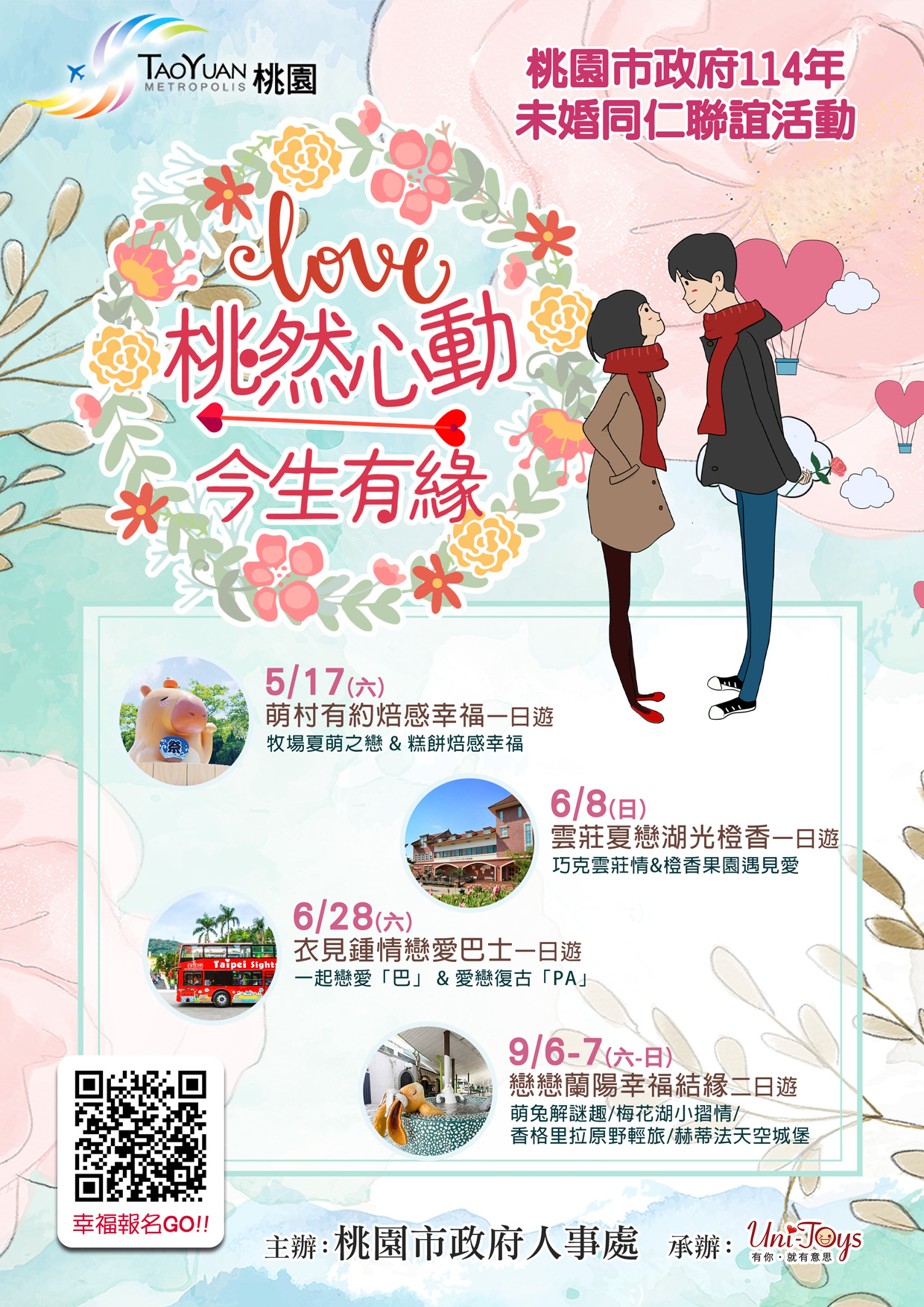 (一)活動內容:114年9月6日及7日(星期六及日)「戀戀蘭陽幸福結緣二日遊」,假礁溪幾米兔子廣場、梅花湖、香格里拉休閒農場及赫蒂法莊園等地辦理,每人報名費用新臺幣4,900元,參加名額以40人為限。