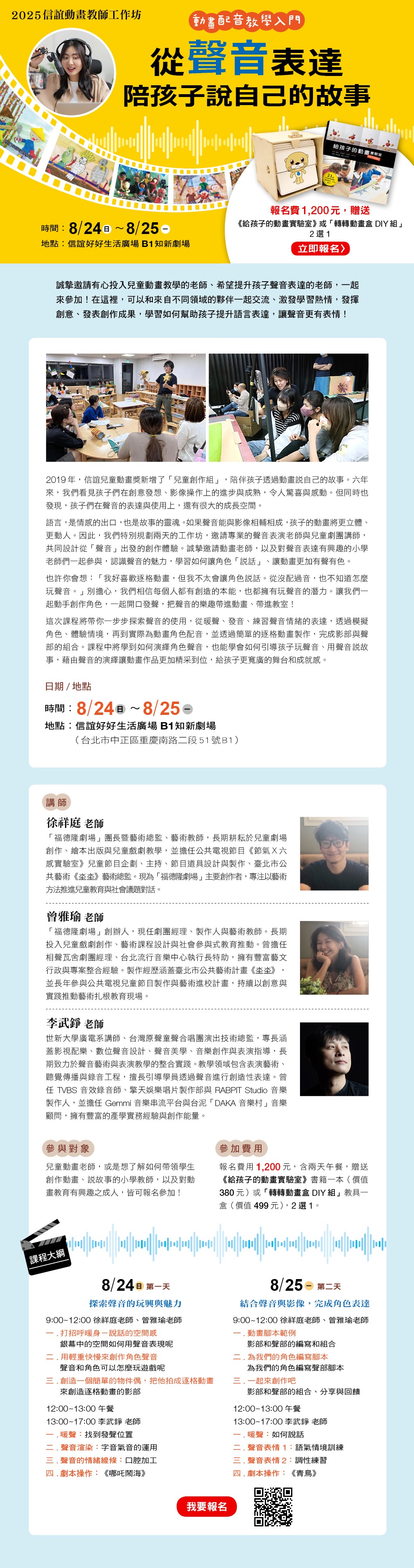 主旨: 舉辦「2025信誼動畫教師工作坊-動畫配音教學入門」,敬邀貴校教師報名參加,請查照。