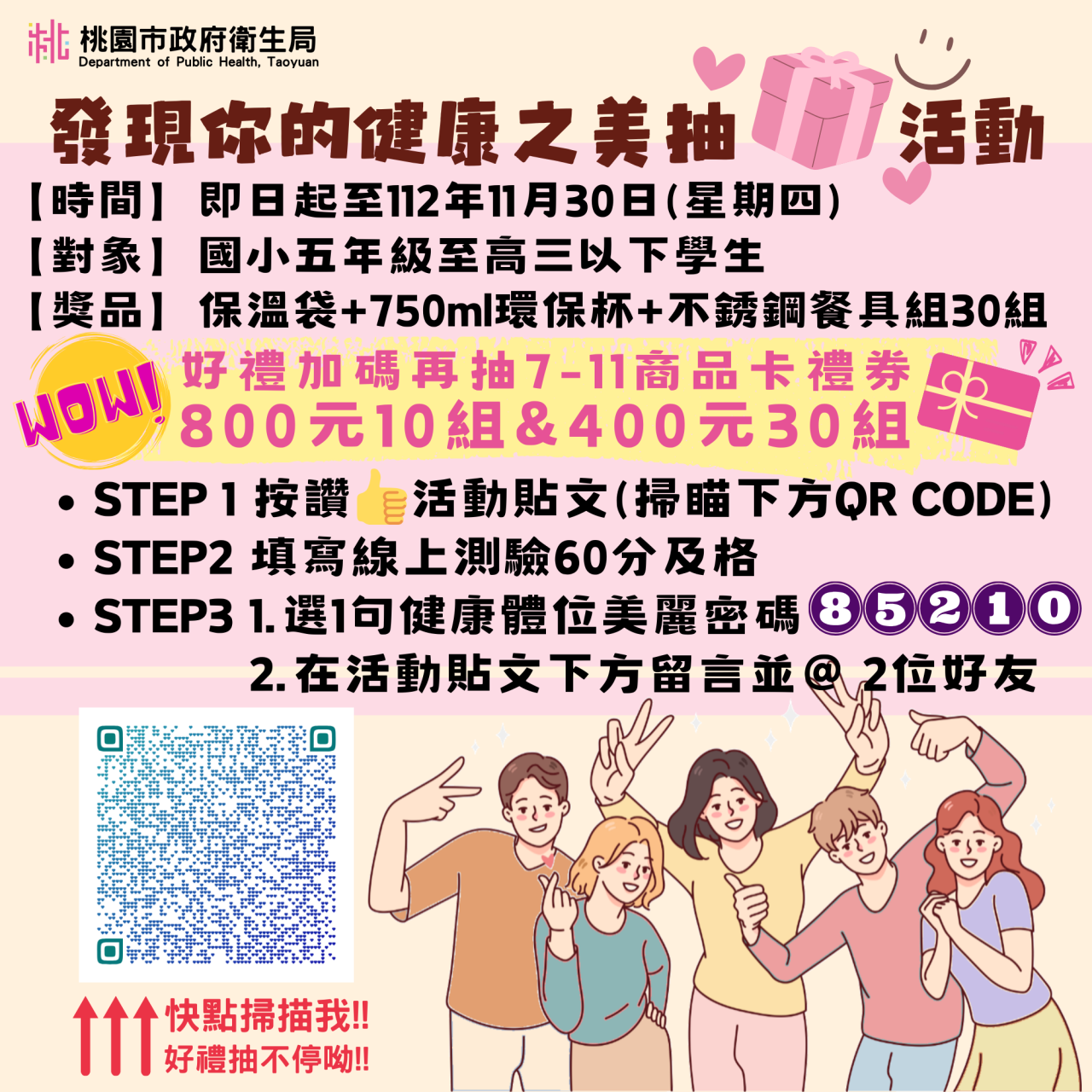 二、 | 為強化青少年正確健康體位知能,消除體態與容貌焦慮,破除傳統身體意象的迷思,推廣「健康就是美」,拒絕追求別人的身體外貌標準,建立青少年對自我身體體態及意象之認同感,爰本府衛生局辦理旨揭抽獎活動。 |